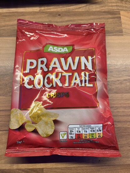 Asda Prawn Cocktail Crisps Good in crunch and flavour. Posted on 07 May 2023, 08:20 Asda Prawn Cocktail Crisps Good in crunch and flavour. 3/5 ⭐️⭐️⭐️ #SnackReviews Original on Mastodon
